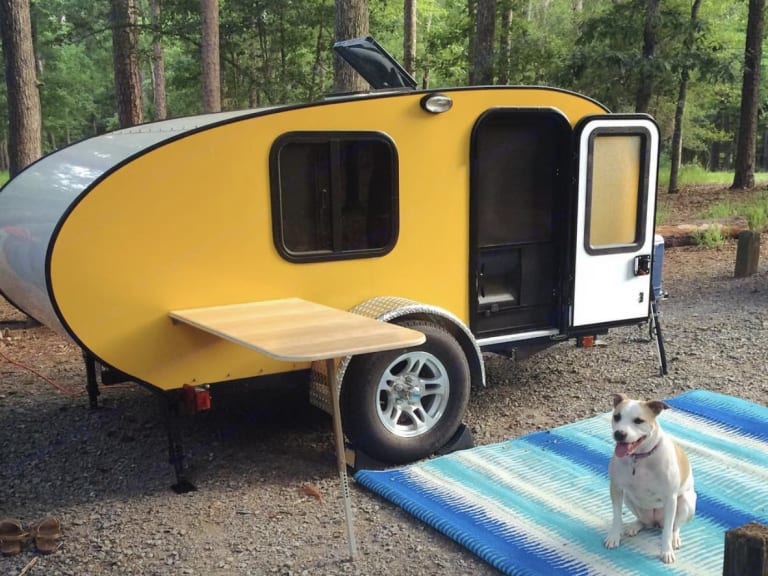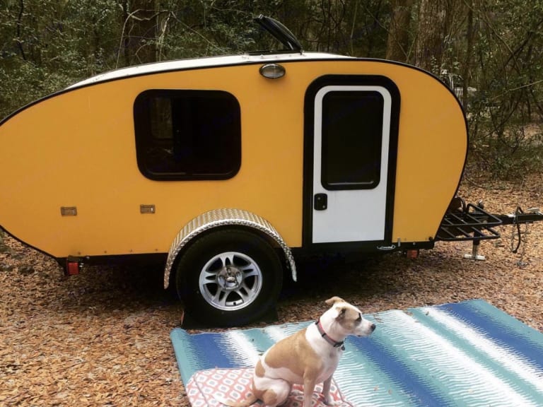 Simple, comfortable and Pet Friendly teardrop camper that sleeps 2. Easily back in this tiny trailer, drop the feet in the back, use the knob to quickly level and you’re good to go. Setup can easily be done after dark if needed.Inside dimensions are 4ft tall, 5ft wide and 10 ft deep. Bed, counter w/ underneath storage and small "walkway" in front of bed makeup the inside. 2” ball hitch and 4 pin electrical connector needed.What's includedIncluded: