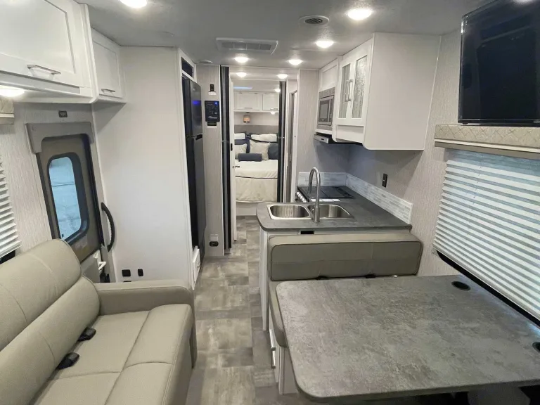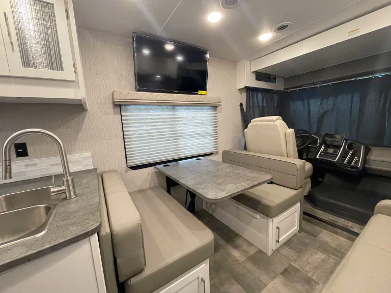Live your best life on the road with this motorhome! The rear private bedroom has a 60" x 74" queen bed to lay your head on at night with wardrobes on either side of it for your clothes. A separated bathroom makes it easy for one person to freshen up in the 24" x 32" shower while another uses the private toilet and sink. Enjoy home cooked meals while out on the road with the stainless steel three burner cooktop, the stainless steel double door 10 cu. ft. refrigerator, and even the stainless steel microwave oven. Eat your meals, play card games, and even transform the 42" x 70" booth dinette into an extra sleeping space. The 63" sofa has storage below for an extra blanket or board games. If you need to get some work done while you're away then you will appreciate the computer work station with 12V, 110V, and USB outlets in front of the passenger chair!