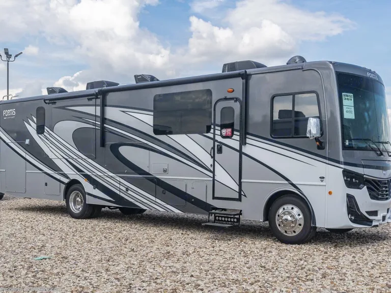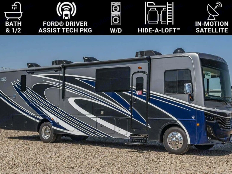 The Fortis 36Y sets the new standard when it comes to family-friendly thanks to the Kid Kave. This unique feature creates a fun hideaway at the rear of the coach, providing kids a perfectly cozy nook for hanging out, having slumber parties, and making memories.The Kid Kave features a balcony loft with storage underneath. There is also an option for an all-in-one washer and dryer. A jackknife sofa, additional wardrobe, swing LED TV and dedicated half-bathroom help make the Kid Kave a fun-filled retreat for kids of all ages.Overall, the Fortis is built to get families where they’re going and is loaded with features to maximize comfort, safety and convenience. The open and spacious galley along with the L-shaped dinette, residential style appliances and additional pantry storage will have the entire family smiling. Don’t forget the exterior kitchenette, with microwave, sink, and a griddle for entertaining.Your crew of ten will love this spacious coach! There is a full-wall slide plus a queen bed slide out that will provide ample space for everyone to stretch out. Your guests or the little ones can sleep in the rear private bunkhouse suite with a bunk bed, a jackknife sofa, their own swing LED TV, plus a half bath; how convenient! You will have the private bedroom all to yourselves with a Serenity Series RV queen bed, dual wardrobes, and a bedroom LED TV with a dresser to keep your clothes tidy. After a day of traveling, everyone can relax in the main living area on the jackknife sofa or at the L-shaped dinette. There is a third LED TV here plus a Hide-A-Loft electric drop-down bunk for one or two guests. The kitchen includes everything you need to prepare meals each day, including a three burner cooktop, a stainless steel convection microwave, a residential refrigerator, plus a pantry for snacks and paper goods. And don't overlook the exterior with its exterior kitchen that includes a mini-fridge and pull-out griddle, plus a quick connect spray down hose and storage!The Fleetwood Fortis Class A gas motorhome is a powerhouse of luxury and convenience, and it also is quite literally a powerhouse with its Ford 7.3L V8 350HP engine with 468 LB/FT of torque. The construction includes a Dryseal edge coating for all ceilings, walls, and floor, and the Powerlock System 2 has interlocking walls to the roof for stability. Automatic hydraulic leveling jacks make the set-up process easier, and the cab has excellent features, like a 9" stereo with AM/FM/Bluetooth, backup camera, reclining/swivel cab seats, driver/passenger center table, and an automotive-style dash with dual monitors and workstation. You will find vinyl tile flooring all throughout the interior, as well as full-extension drawer guides with latches, coordinating window treatments, and energy-efficient LED flush-mount ceiling lighting.