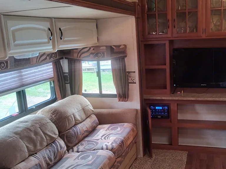 Well equipped 5th wheel RV, spacious layout, await your camping experience.