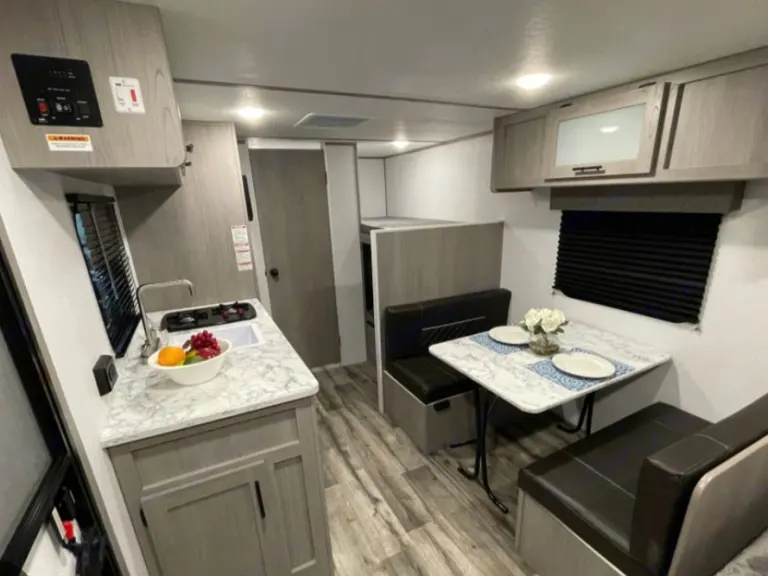 Clean efficient cozy 17' travel trailer. Easily pulled by a suv or bigger vehicle. This RV is equipped with air and heat to relax and sleep comfortably for your next day's adventure! Generous layout of space with an electric awning to protect you from the elements. Rv is equipped with a electric kettle, bbq utensil, 4 plates, 4 bowls and silverware. Complimentary soap, shampoo and conditioner will be supplied along with toiletries. This is a non smoking unit. Bedding and towels aren't supplied.We’re happy to provide towing tips, walk-throughs, and quick responses to any questions. We can’t wait to help you hit the road or get you set up on your site to make memories that last a lifetime!