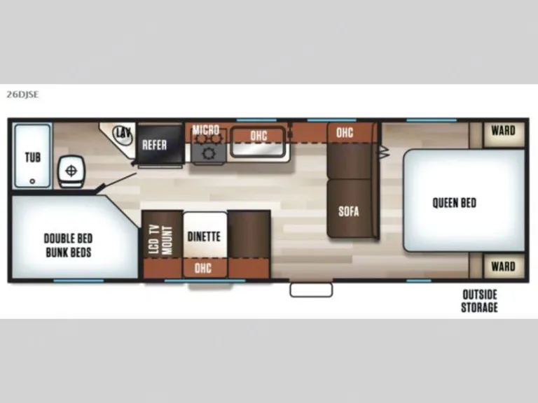 Camper sleeps 7-9 people! This model offers a rear set of double bunks, futon style couch, a dinette that turns into a bed and a front bedroom. The double bunk beds which features sleeping space for four people! The front bedroom has a queen bed and two wardrobes, plus there is an accordion door which gives you a bit more privacy in the room.The kitchen area features a large sink, three burner range, microwave, and refrigerator.The bathroom which is in the rear has a tub with shower, toilet and sink.There are plenty of overhead cabinets throughout the travel trailer, as well as outside storage, and so much more!Unit also comes fully stocked with dishes, utensils, and pans.