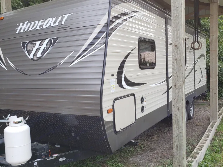 This trailer has a lot of room, with a queen size bed, 2 bunk beds and the table being able to turn into a bed you can fit the whole family. It also has a slide out to allow plenty of room for everyone to move around.
