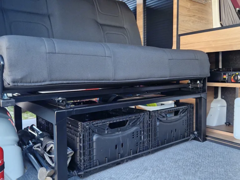 CG Ctte 3 places (Banquette double AV, rabattable en 2 secondes, qui permet d’asseoir 2 personnes côté aménagement, avec un grand coffre de rangement intégré).