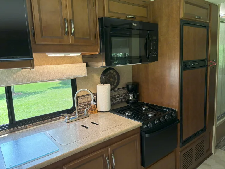 Mrytle came to us really by accident. Our family had been looking for an RV and the minute we saw her we knew she was the one for us and now we want to share her with you. She is incredibly easy to drive and handles well. Myrtle can easily sleep 4 adults but also has room for 6, if necessary. There is a queen bedroom with an ensuite bathroom, the dinette converts to a full bed, the cab-over boast a twin bed with its own LED lighting. The couch, which I have found to be very comfortable, can accommodate a child or smaller adult. An air mattress fits perfectly in front of the couch. Linens will be included for the queen bed, the dinette bed and the cab over twin bed; an air mattress can be included upon request. You will find the living area open and comfortable with LED lights around the slide out. The kitchen area is stocked with the basics but sufficient enough to make a meal in the comfort of your rental. Included are dishes, silverware, serving utensils, coffee pot, coffee cups, drinkware, crockpot, skillet, 2 cooking pots, and a small baking sheet as well as ice trays and ice bucket in the freezer.