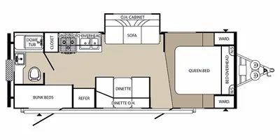 Perfect for families. Sleeps 8. One slide out, where the couch is, allows for more walking room and a more open feeling inside. 11 inch memory foam queen bed with partition to separate the bed from the rest of the camper. Two bunk beds in the back of the camper. Couch and dining room table convert to beds. Outdoor speakers, awning, everything works great!