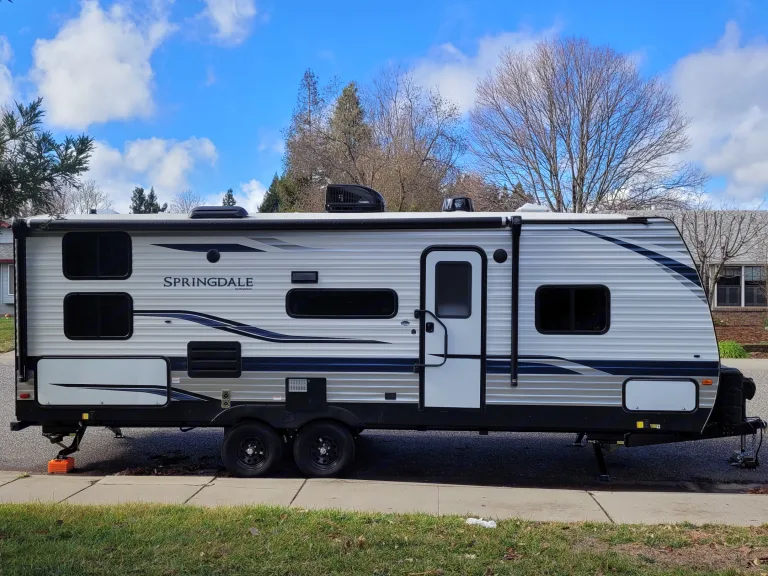 The Family Adventure Rig, or FAR as we like to call her, is a 2020 Keystone Springdale 240BH, and it is Awesome! Whether you are headed to the lake, parking on the coast, or headed up to the ski resort, FAR make the journey just as amazing as the destination.At just over 28 ft this rig is the perfect size to take the whole family with out pulling a monster behind your vehicle. FAR has a single slide out open up the floor space, with aovely dinette tbag converts into a bed for the little ones, teens or adults, the separated bedroom at the front of the rig has a Queen bed, with over head storage and two closets, as well as a laundry shoot.The entire rig has "hardwood floors" throughout (minus the dinette area) for easily sweeping the sand out on your beach front vaction, or pine needles from your ski trip!The kitchen is Amazing!! it has a modern rustic farm house feel with all the amenities you will need, a deep sink, a stove, an oven, microwave and a pretty massive fridge!The bathroom has a shower and vanity with storage for your toiletries.And the most important part!! Bunkbeds!! we have a total of 6 kids and have been able to comfortably fit all of us plus our dog Sumi with no problems! Each bunk easily fit two teens, and 3 toddlers, and pro tip there is a section on the side of the bed we were able to keep our infant during the evening. Each bunk has USB ports, lighting and a privacy curtain. Speaking of privacy the kids bunks are on the opposite side of the bedroom! There is a flat screen Smart TV hanging above the fire place (floor heater) and one in the bedroom.Outside you will find a brand new awning with LED lights, outside lights, two propain tank and 2 batteries, there is an out door shower to clean off the cool salty ocean water, from our fresh water tank, there are also hook up. UT the winner here is the out door Kitchen!! With a mini fridge and television hook ups.Take the whole family and the fur baby's on the trip of a lifetime!RecommendationsIf you are not confident backing up a travel trailer, I would recommend getting a pull through site, but with some patience and good communication via the driver and your spotter you will be fine as the trailer is only 28 feet long. Other things to noteWe have pets, and we know the limitation of traveling with pets, we want the whole family to enjoy the trip, including your furry loved ones, we only ask that you respect our travel trailer and keep pets off of the furniture, replacing rv furniture is a lot more difficult than standard home furniture so we again ask you to keep you pets off the furniture.SMOKING OF ANY KIND IS PROHIBITED IN THE TRAILER.Please do not flush anything down the toilet other than the RV septic friendly toilet paper.Most important make sure to have a great time, ravim kh kids can be tuff we are experts in this field, just slow down, breathe , the trip is going to be great.