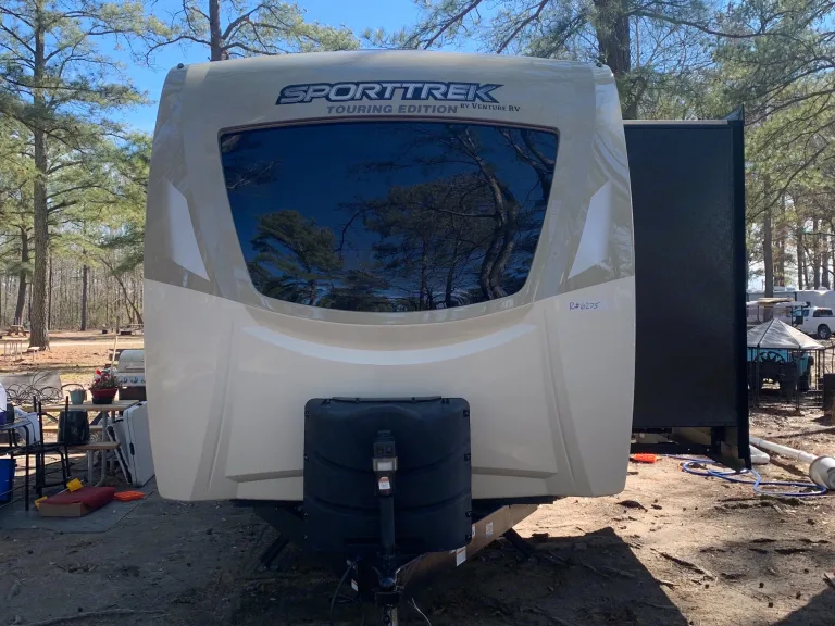 This is a very roomy family oriented has a very large bunk room with a t.v.,couch that can fold out to a full size bed and table that is also in so has outside shower to rinse off when you get back from the beach.With lots of ce play area for when the weather doesn’t cooperate to go has a very large outside kitchen/entertainment center for watching a 40 inch t.v. outside with a small fridge and outside stovetop not to mention small countertop and also has two leading right into the half bathroom and one into the main living when your entertaining outside people don’t have to walkthrough your living room area to use the side the living area we replaced the original uncomfortable foldout couch with a complete leather couch that has automatic buttons to recline.We also replaced the fold down kitchen set with a regular homy one for two has the larger refrigerator in uble sinks with sprayer/straight stream also has a 40 inch t.v. In the living area with a fireplace.We also have replaced the mattress that came with the unit with a 10 inch hybrid so the master bedroom has a huge window for a nice ere is also a another fireplace in the master bedroom with another bathroom,where you have access threw the bedroom or threw the main living area with a glass enclosed shower.What's includedCoffee pot with filters,toaster,air fryer,all cooking utensils,pots pans, plates,cups and silverware for four people.Sponge for dishes and trash can.There are no linens provided.RecommendationsUse only Rv toilet paper and drop ins after sewer/toilets have been dumped.All will be provided unless extra is needed.Other things to noteAll we ask is absolutely no pets,no smoking and the unit is cleaned and returned in the same condition as it was left. There will be a no pet fee and a cleaning fee.This is a 50 amp trailer.We also can deliver only on certain days and times.Up to 50 miles with a minimum fee of $250.00.