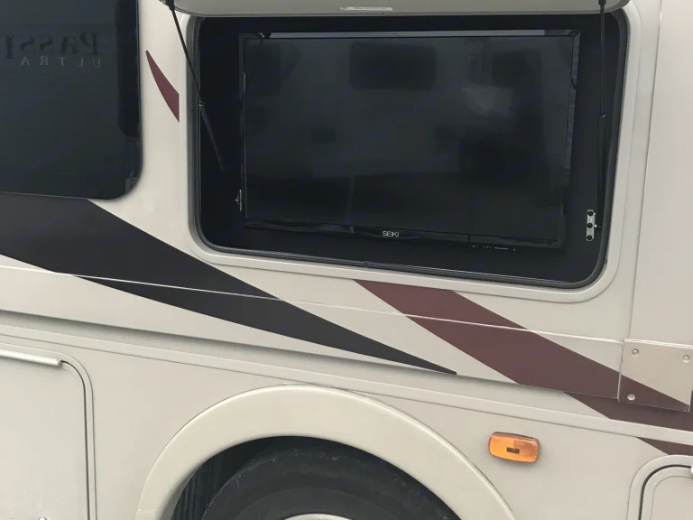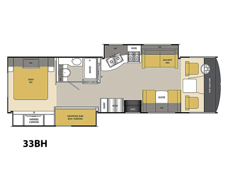 2016 Coachmen Pursuit 33BHP which sleeps up to 8. This Class A bunk house motor home is approximately 33 feet in length with two slides, a Ford V-10 engine and Ford chassis. Decked out with Taupe exterior, bedroom TV, side cameras, frame-less windows, power heated mirrors, valve stem extensions, pleated day/night shades, 5.5KW Onan generator, 50 amp power, 2nd A/C, automatic levelers, exterior entertainment center, bunk TVs, and more! This Pursuit comes with a power drop down overhead bunk, ball bearing drawer guides, hardwood cabinet doors, cockpit table, 32" LCD TV with DVD player, roomy bathroom and shower, pantry, pull-out pantry with counter top, power bath vent, skylight, double coach battery, heated holding tank, cruise control, back up monitor, power entrance step, power patio awning, 5,000 lb. towing hitch with 7-way plug, roof ladder and much more.