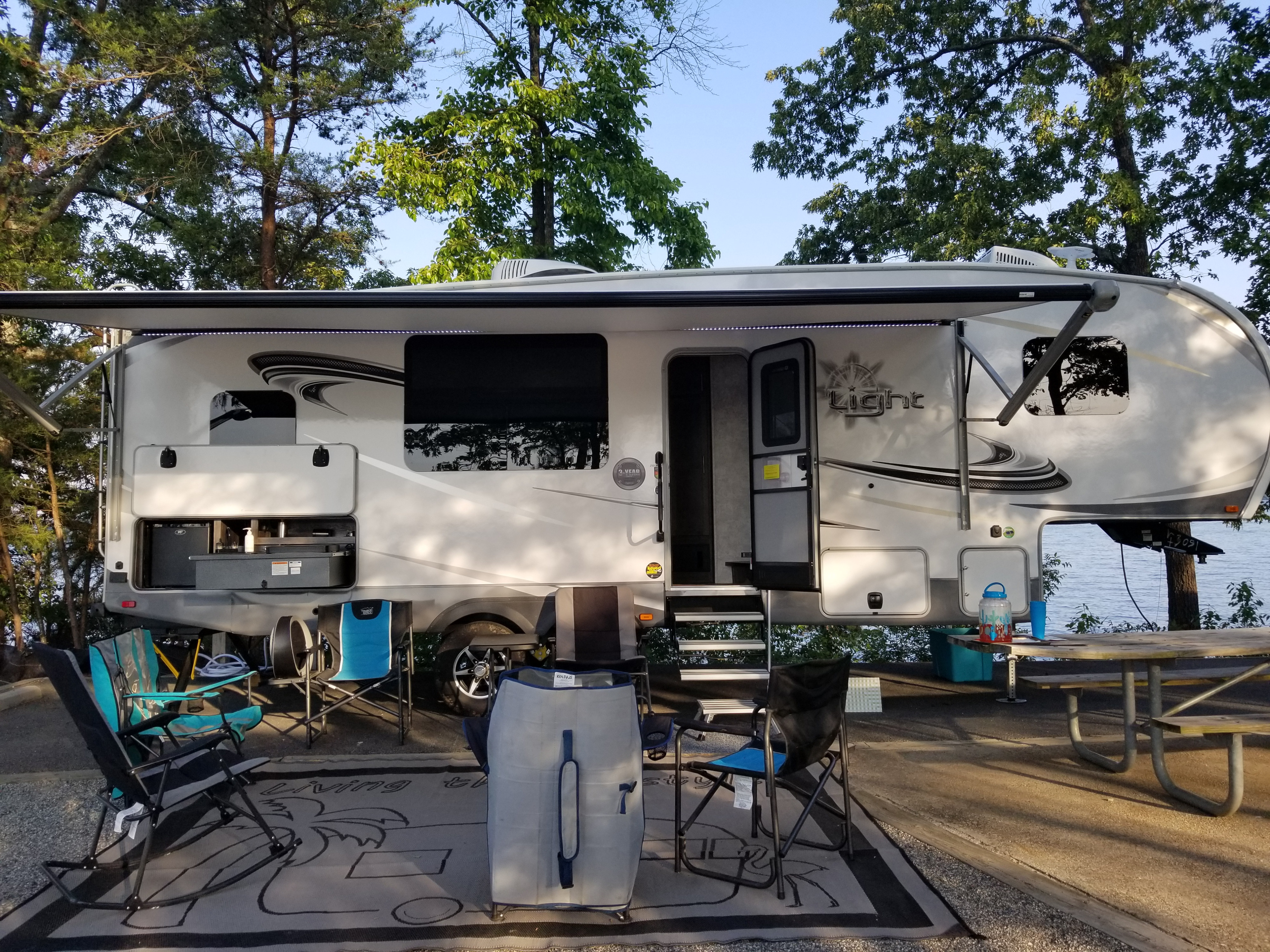 This is a brand new fun filled camper, outdoor kitchen with sink , fridge and stove. it has a 20 ft awning with speakers at the push of a button. Recliners inside with heat and massage, large shower , bedroom has Queen size bed and also a full size bed in the kitchen very comfortable. It has two A/C unites with two separate controls for the comfort of everyone.