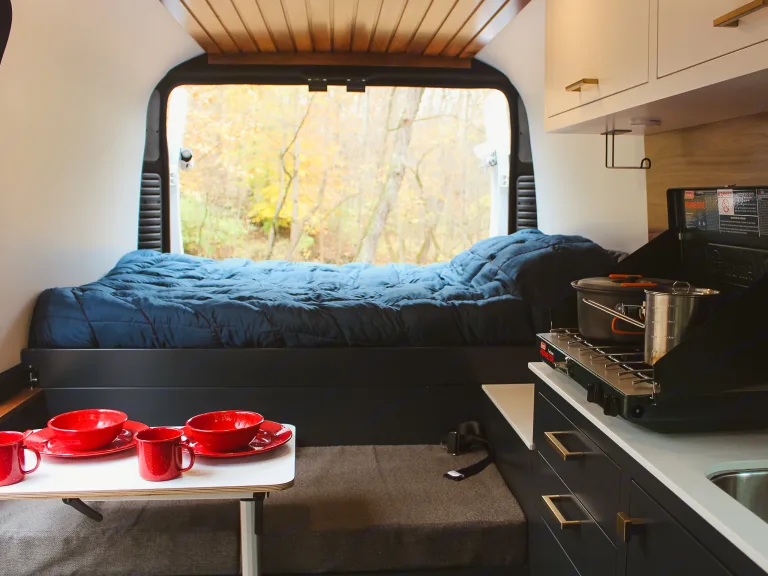 The Explorer is all about comfort. With a 5” memory foam mattress, and a queen size bed, the Explorer takes camping to the next level. This van is ready for any weather or season, with a ceiling fan to keep you cool on summer nights, and a heater to keep you warm and cozy in the winter. The kitchen is fully equipped with a portable stove, sink, a Yeti cooler, and everything you’ll need to cook.
