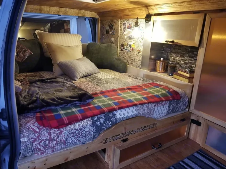 Updated to your current glamping standards, super soft bed. Solar panels and batteries for all-night movies next to the fire. Ride undercover with Wolfe Construction on the side and park anywhere, no campsite needed. Van was built with tall people in mind, cant stand but sleeps comfortably. What's includedFresh linens on giant super comfy queen bed, slide out drawers for extra storage.