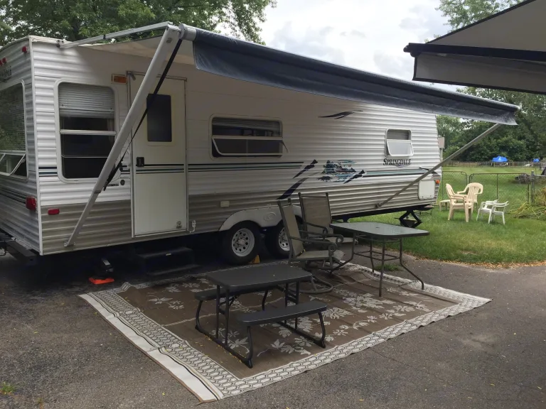 Spacious 27 foot travel trailer that sleeps up to 6 people. It has a private front master queen bedroom and rear living area with lots of natural light. There is a TV in the living area as well as a radio and CD player. The dinette converts into a bed and there is a jack knife couch. There is a full bathroom with a tub and shower.The trailer is equipped with all of your needs. The kitchen is stocked with utensils, pots and pans, dishes and cups. There are towels and bed linens in the camper as well. The power, water and sewer hoses are all included as well.We are willing to transport, set-up and tear-down the RV for an additional cost if desired.
