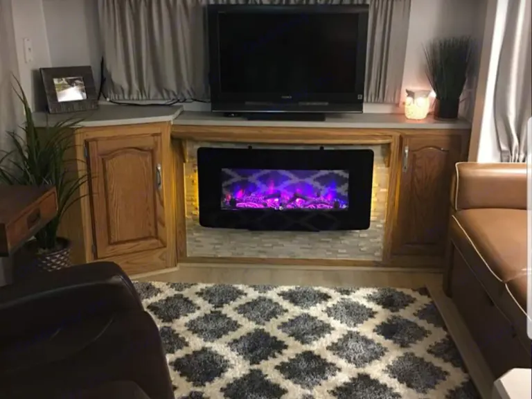 An amazing interior redesign with hardwood floors, tip out, cozy electric fireplace, leather sofa and recliner. Upgraded tall sink faucet with beautiful tile backsplash. Bathroom is an upgraded rv toilet that's like having the comforts of home. Queen size bed in the main compartment with a new mattress. Couch also pulls out into a small bed. This is a cozy but large RV for a couple to take on a fun and romantic vacation.