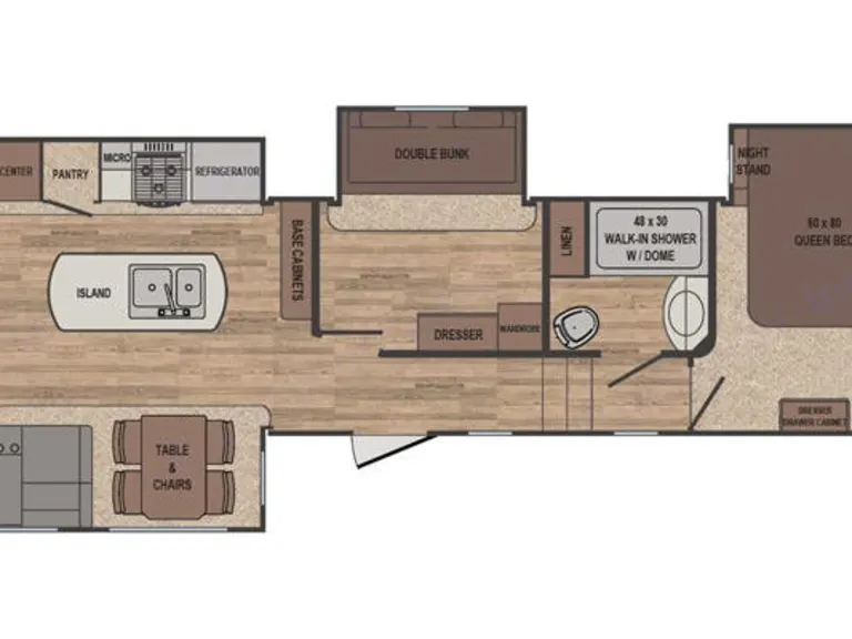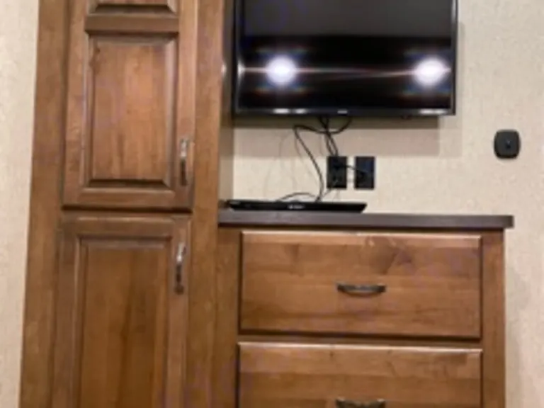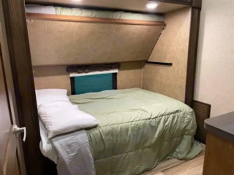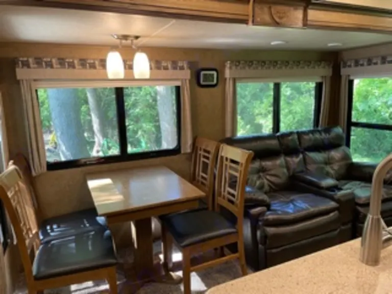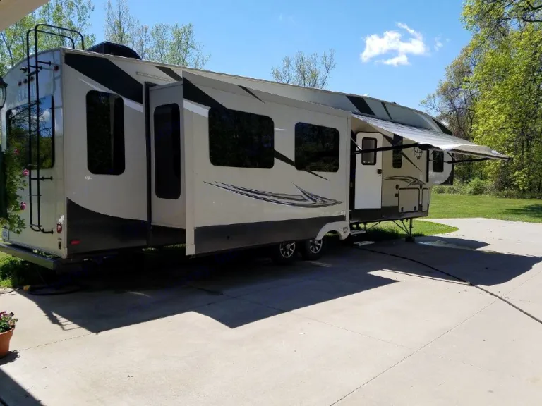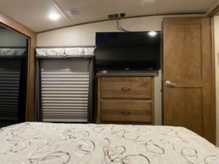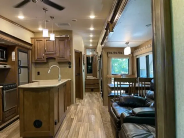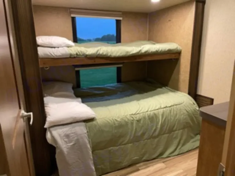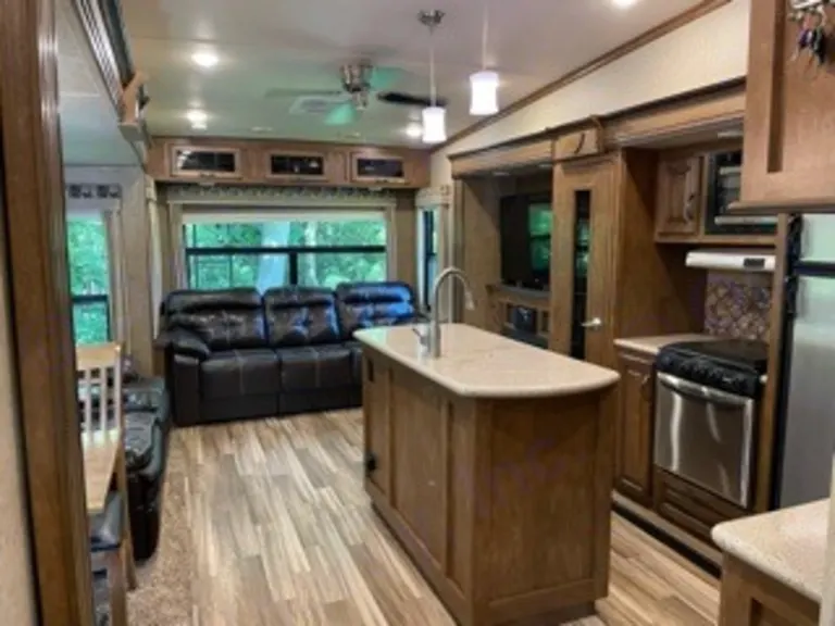 Check out this enormous fifth wheel. Master bed has queen bed with memory foam mattress, smart TV, and dedicated AC. Separate bedroom has twin over full bunk beds and smart TV. Kitchen comes fully equipped with 3-way fridge, full-size pantry, gas stove/oven, and kitchen island. Living room has dual recliners and full-size couch that converts to a queen bed, smart TV and electric fireplace. Outside, this camper has a large awning, integrated speakers. Tables & 4 camping chairs included. In the summer, this RV needs 50 amp service to run its two large AC's. On those cooler days, this RV can operate on just a single 15 amp plug. Heat source is propane furnace and electric fireplace.Want it delivered? Delivery and setup is also available within 60 miles.What's includedThis camper comes with everything you will need, including: