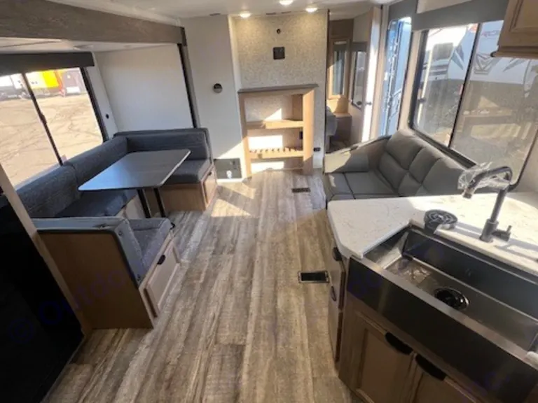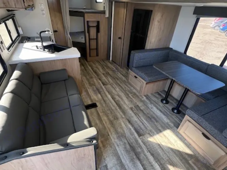Features A/C, one slide out, front private queen bedroom, jack knife sofa, U-shaped dinette, large fridge with freezer, pantry, rear double bunks, rear private bathroom, stove top, air frying convection oven/microwave, plenty of storage space, and more!Pickup Time: Between 1 pm - 4 pm