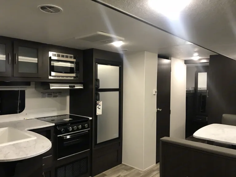Campers has front bedroom with queen size bed and closets for clothes, rear triple 6 foot bunks with pocket door for privacy, dinette converts into a bed full bed, couch also easily converts to a twin bed.Trailer amenities