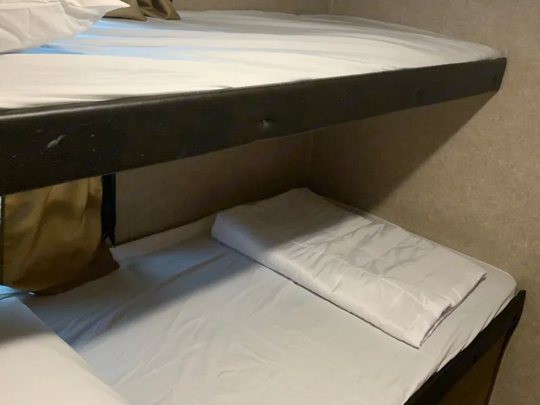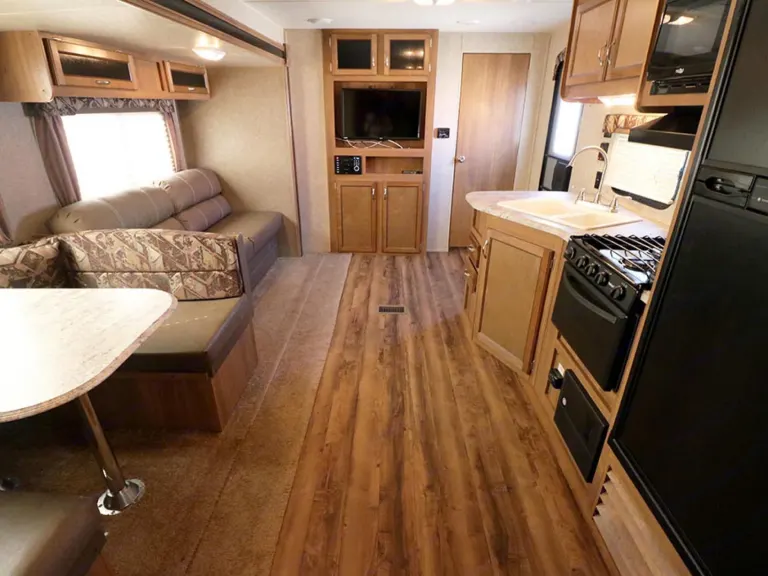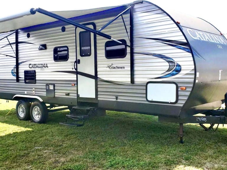 One main living slide out, two room bunkhouse RV ready for your family! 2 ACs, central heat, 50amp bumper pull. Plenty of sleep and storage space. Modern vinyl flooring, leather interior. TV with Roku. Stocked with dishes and basics like coffee and sugar. Some snacks for the kids and a few drinks. Surround sound indoor/outdoor radio. LED lights on the 10ft awning. Relax outdoors while being able to sleep comfortably in the “Catalina Winemixer” fully stocked RV.