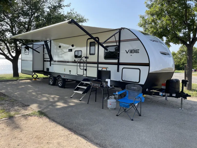 Are you ready to pack a whole lot of fun in a great travel trailer? Well, come choose ours! A comfy Denver pillowtop mattress to make you feel right at home. You'll love the oversized panoramic windows in the living room so you can see the beautiful views outside. The dual opposing slides in the bunkhouse provide the kids plenty of room to stretch out or play a board game on the floor. Great camper for the entire family! Get an early start on your next adventure with this Vibe travel trailer!What's includedCamper comes ready to sleep 10 with linens for all beds. Also comes fully stocked with plates, cups, and utensils. 5 folding chairs included, as well. Blackstone adventure 22in can be requested. Delivery and pickup within 150 miles. Other things to noteWe love animals but please do not bring them on your trip! No smoking, tailgates, or festivals. Delivery only, no pickup available.