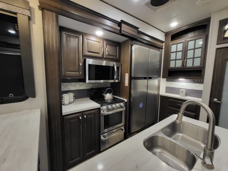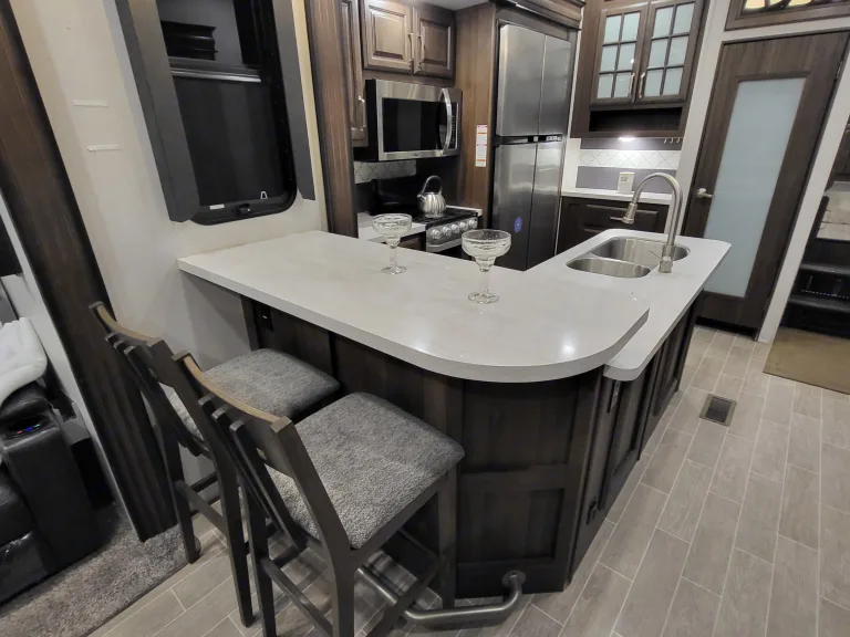 Avalanche luxury fifth wheel RV models offer spacious living with their full-profile construction, unique wide-body design, high ceilings and frameless panoramic windows. Included are enhanced comfort features and entertainment options, such as:Kitchen & Dining
