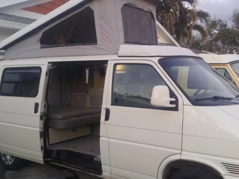 This is a 2000 Winnebago VW Eurovan with the full camper package. There are two beds, a bunk underneath and one up top that is accessible once you pop the top up. Although this van can seat 4 people it really only sleeps up to 2 people comfortably.The camper is equipped with 12 gallons of water, a sink, a outdoor shower/ rinse station, and a small cook top which runs off propane. There are also hookups for water and electric if you are staying at a campsite. (This camper does not have a bathroom in it, but a portable camping toilet can be provided)Included in the rental price are clean linens, cooking utensils, use of an external propane stove (The propane stove-top has been disconnected for safety and also because we prefer cooking to not be done in the vehicle) , extension cord for city electric, 10ft hose for filling up the water-tank, 100 miles of travel/ day.When you rent from us we do expect a few things.1. The camper must be returned in the same condition that it was picked up in.2. If something does happen where you breakdown, or there is damage to the vehicle, you notify us immediately.3. You have a great time camping!Optional items which can be included (for an addt. charge) or will be added on if the camper isn't returned in same condition are:Optional:Portable camping toilet= $20Surcharge fee/ Addon:Cleaning fee surcharge= $50Gas tank not filled= $50Mileage overage= .30/mileWe make a big effort to provide our renters with well maintained vehicles as well as a great camping experience so we do ask that you please take care of them and please ask if you have any questions.Nearby Campgrounds include:Jetty Park in Cape Canaveral (2 miles from our pickup location)