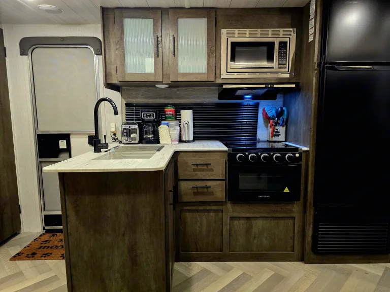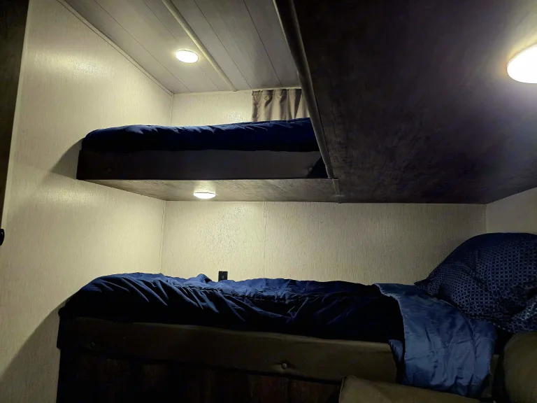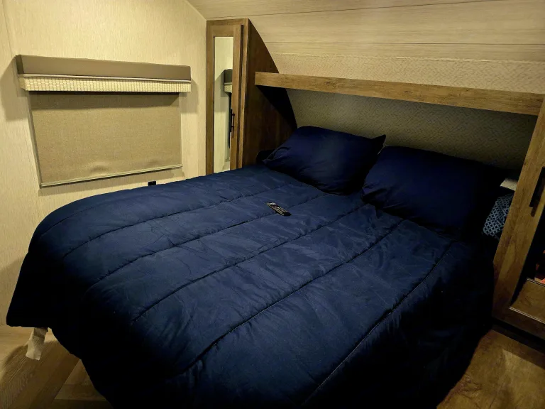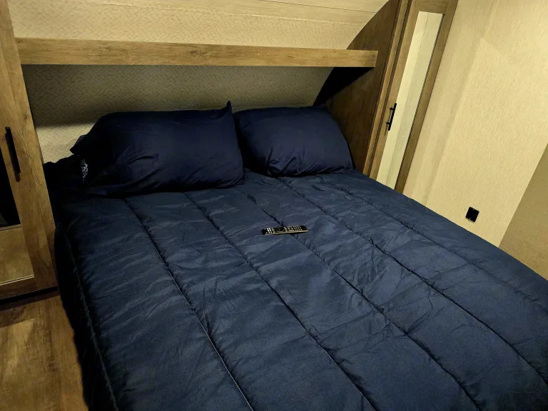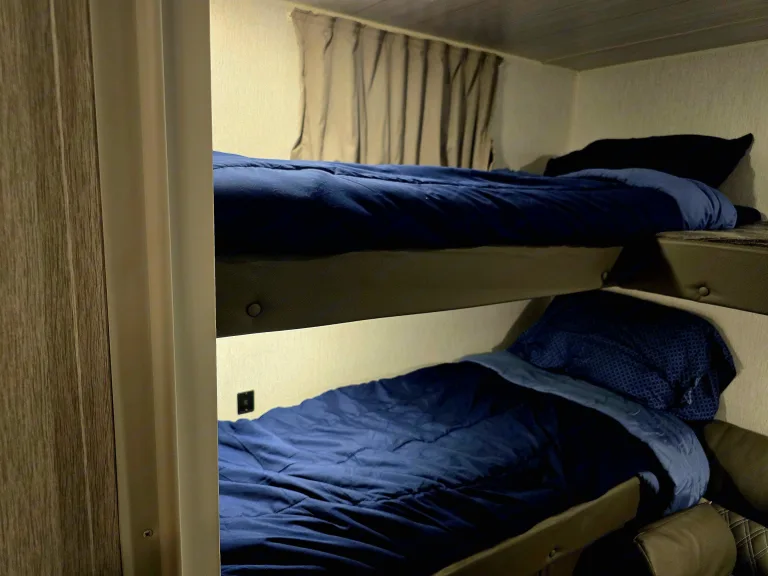 2022 clean and comfy Forest River Cruise Lite. The 2022 Forest River Salem with Bunkhouse is the perfect size for a family or a group of friends, comfortably accommodating up to 10 guests. With it's 2 bedrooms and split floorplan, it offers both privacy and ample sleeping space. The primary bedroom is located in the front of the camper and features a camper Queen size bed, a Smart TV, separate closet spaces, and under bed storage. In the rear of the camper, you'll find a bathroom and the 2nd bedroom/Bunkhouse, which includes 2 twin-size bunks, a queen bed/pull-out couch, an entertainment center, Smart TV, and storage. Two tv's for entertainment along with outdoor speakers, Bluetooth audio. Living room has a built in color fireplace and plenty of room to relax and unwind. RV has spacey kitchen with full size refrigerator, microwave, stove, sink and gas stove top. Plenty of storage under the couches and in the pantry. The Versa Lounge couch and U-shaped dinette can be converted into two additional full-size sleeping areas, providing extra flexibility for sleeping arrangements. The entertainment center is equipped with an electric fireplace for creating a cozy atmosphere during the summer and keeping the camper warm in the winter. Outside includes audio speakers, awning with lights, outdoor grill and fridge. RV also has Level jacks, Sway bar for towing and Tire changing jack.What's included• Bath towels and washcloths