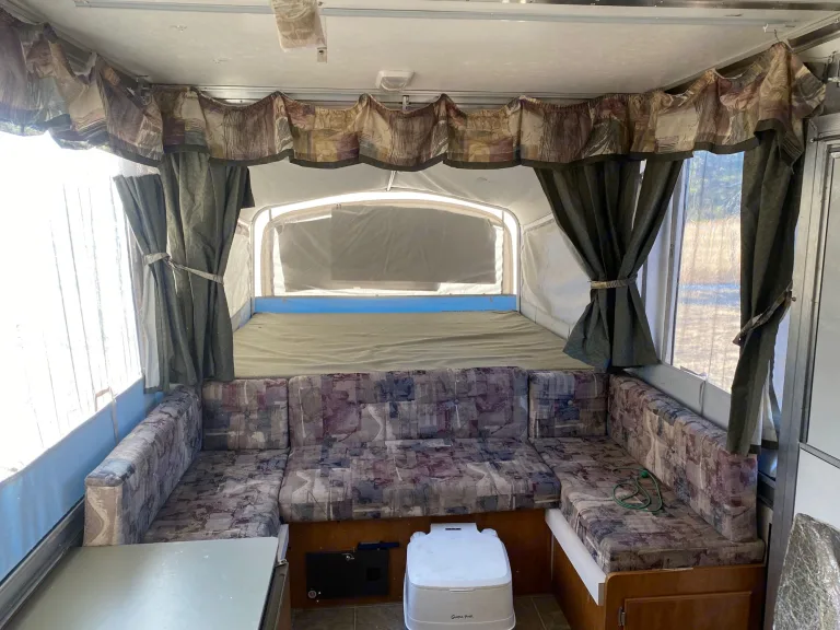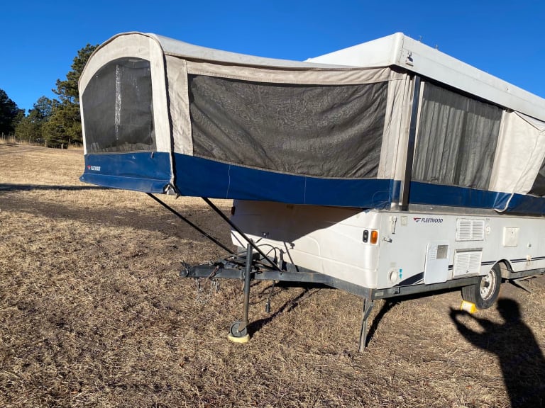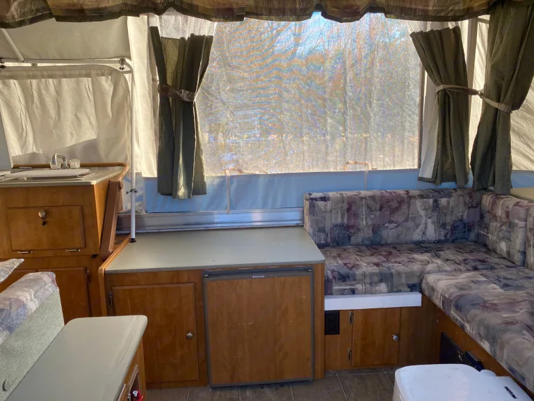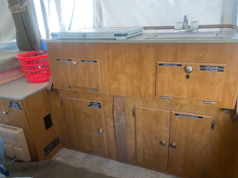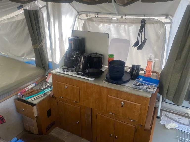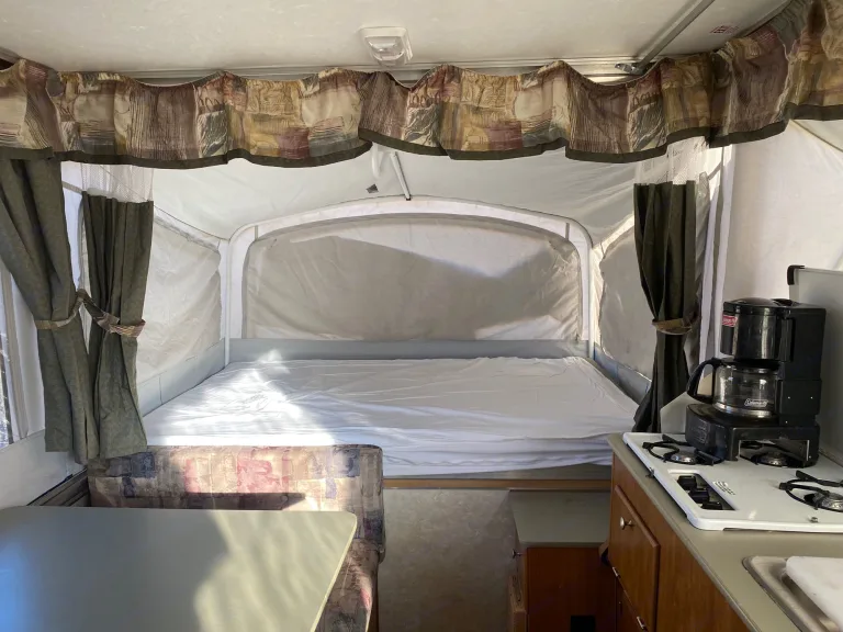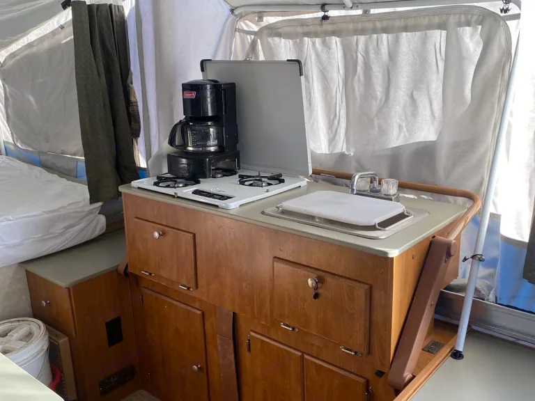 Clean and cozy pop up camper. Cloth sides make it seem like you're tent camping, but with the ameneties of washing your hands, or playing cards at a table if the weather isn't great. Our family of 6 has put Thousands of miles on this little guy and we've loved it! Give it a try!What's included• Coffeemaker and filters