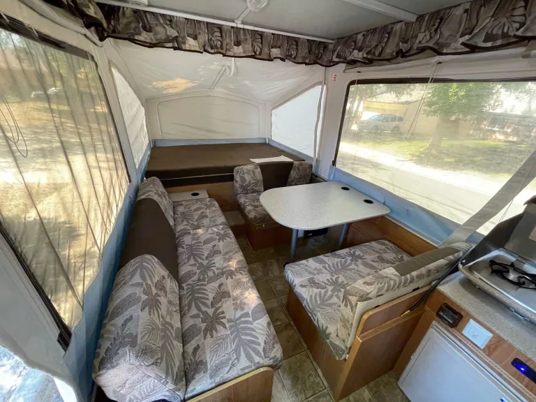 This camper is rarely used and brand new to the rental market. Its always been mature adult owned and kept immaculate. Will sleep 4 adults and 4 smaller type folks easily, could technically be 8 adults. If you’re not accustomed to primarily being inside the camper, it’s perfect. However, the heater will provide endless comfort if you prefer to be inside, while the open windows will make you feel like you’re sitting in the great outdoors. What's includedFresh linens, traditional and usb charging ports, small flatscreen tv and DVD player, exterior shower enclosure.RecommendationsIt will go where the larger campers won’t, but still with 21 feet of interior camper space when fully assembled.Other things to notePlease return it how you received it!