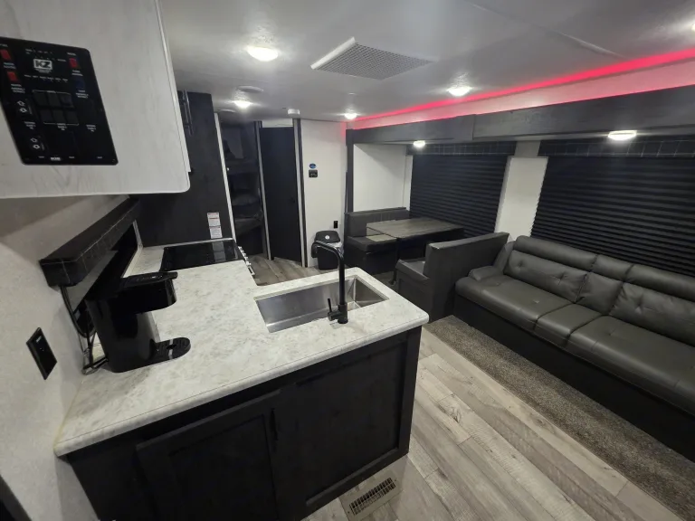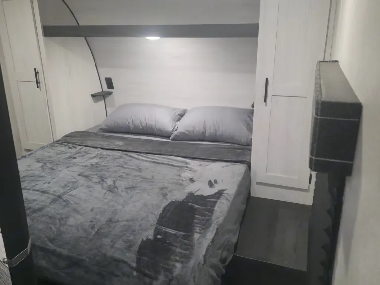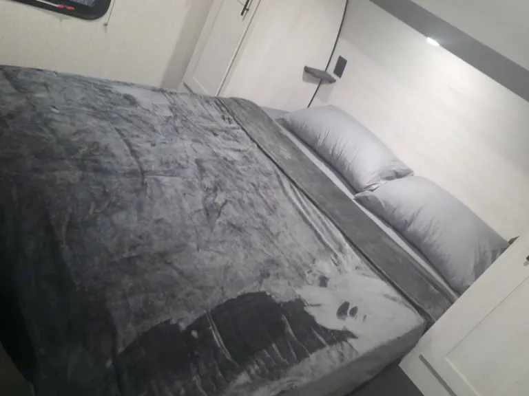 Awning extended and outdoor area prepped✅ Comfort-Ready InteriorQueen bed made and bunk beds prepped with clean linens