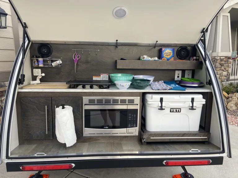 This teardrop is easy to use with lots of features. Boondock capable with an 8 gallon water tank or hookup to water, electrical, and cable at a site. King RV bed with upgraded mattress that sits perfectly under the stargazer window. Blackout blinds that also offer a screen to allow the windows to be opened for a cross breeze. The roof rack is a great addition for adding canoes or kayaks. Side tent and/or popup tent available as add-ons.What's includedFresh linens, 3 camp chairs, Pots, pans, French press, mugs, utensils, plates, and bowls. Yeti cooler will keep your food cool and bear safe. Emergency equipment is in the camper as well as a few dvd choices.Trailer is noted as holding 2 adults. I camp with myself and 2 boys (6&8) in the camper just fine. Side tent can hold up to 2 more people. This is an add-on. Max rental is 4 adults or 2 adults and 3 kids.RecommendationsThe teardrop is great for camping anywhere. We love to pop into basic campgrounds or stay at a fully loaded park. Other things to noteNo smoking in the camper, of any kind. My young boys and I use this and I want it to be a safe and welcoming environment for everyone to use. Pets are allowed but note that it’s a small space. No festivals or tailgating!