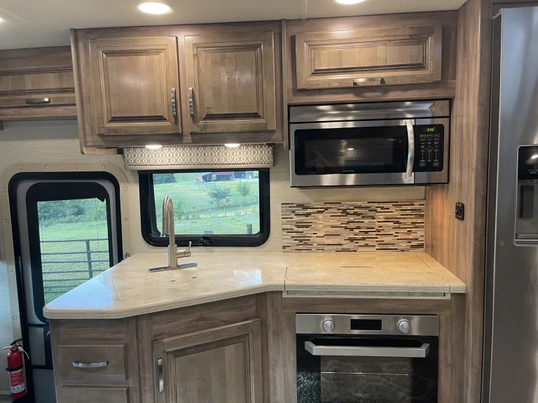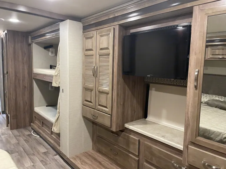 This rental is modern and luxurious RV with all the amenities. It has 1.5 bathrooms and 3 TVs (one in the bedroom, one in the living room in front of the sectional sofa & one in the outdoor entertainment space). It is Bluetooth compatible for listening to all of your favorite music or navigating to your destination. It sleeps 6-8 people. There is plenty of storage space for all of your adventure gear.