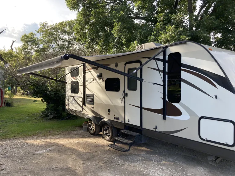 This Jayco is equipped with a master bedroom with a queen size bed. It has a U shaped dinette that turns into a queen bed and also has full side set of bunkbeds. It has an oven, stove, microwave and a refrigerator with a freezer. It has plenty of storage both inside and outside. It comes with automatic stabilzers and awning. It has a large slide out that makes the camper very spacious. What's includedThe camper comes with frest linens and towels. The kitchen is fully equipped with pots and pans for cooking. It comes with a coffee pot, cups, silverware and plates.