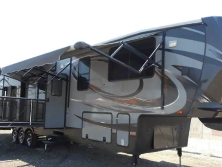 On this camper there is electric leveling, two bathrooms, a side deck, great view from inside the camper, cool loft for small children, big master bedroom and bathroom, sunk in tub for tall people, plenty of storage space, big tv with surround sound,also has two awnings. Plus much more