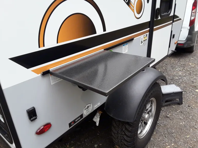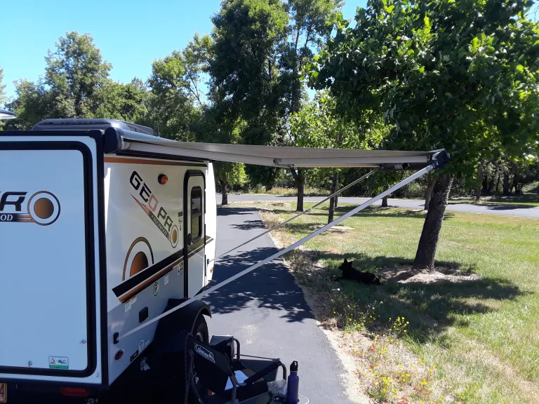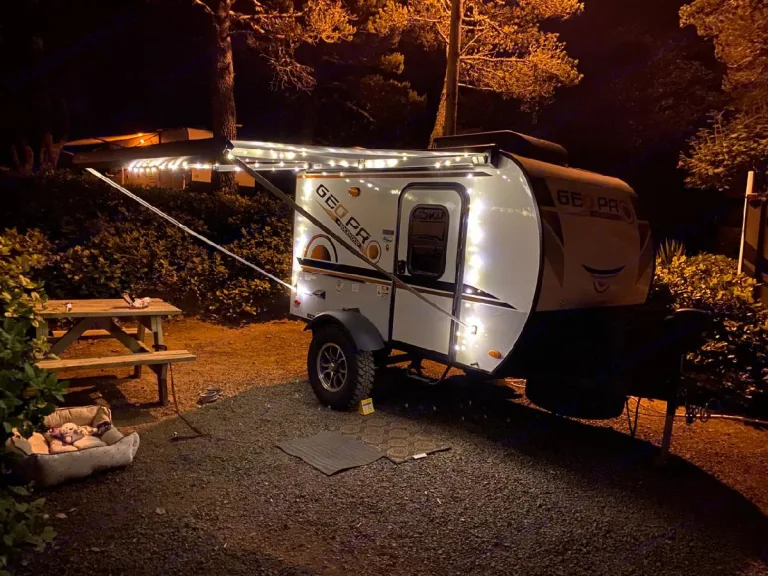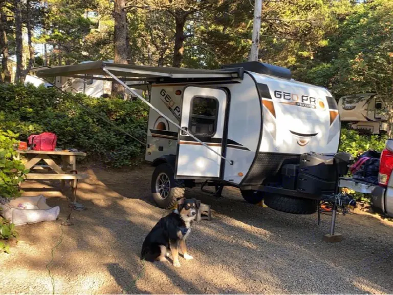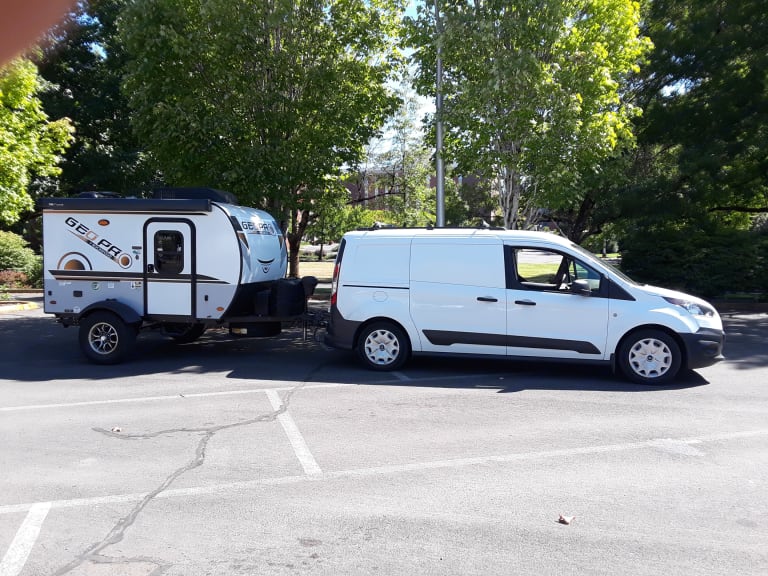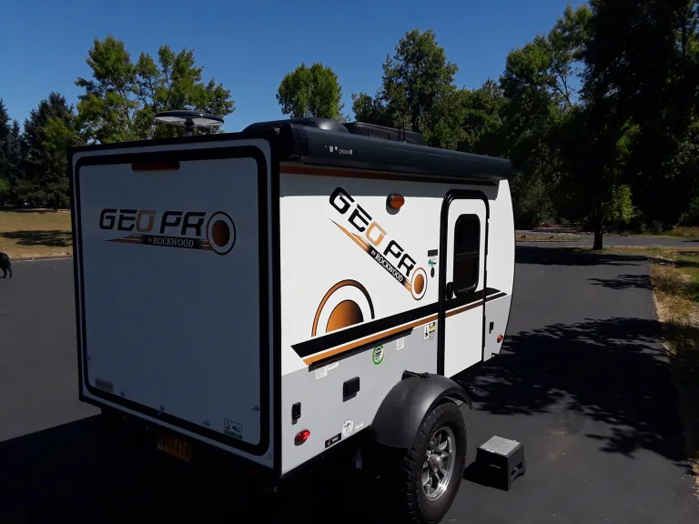 Lightweight trailer (Unloaded weight 1766 lbs) that can be hauled by vehicles having limited towing capacity. Loaded with amenities: AC, entertainment center, Wifi extender, 8 ft. Thule awning, water heater, outdoor shower; 100 watt roof-mount solar panel. The outdoor rear galley includes electric/gas refrigerator, propane stove, 120v microwave and small sink.The air conditioner and microwave are 120 v appliances and require shore power or a generator.The manufacturer (Rockwood) describes the GeoPro 12SRK as having off-road capability. The trailer does have high clearance, but we do not recommend taking the trailer on unimproved roads or you risk your damage deposit.Located 75 minutes from the Oregon coast. This little trailer is ready for your next backcountry adventure. Bring your dog along too!What's includedWe will provide cookware, bed sheets, a small folding table and full propane tanks. Renter should bring pillows, sleeping bags/blankets and camp chairs. RecommendationsOregon coast (60 mi), Crater Lake National Park (179 mi), Mt. Hood (134 mi), Columbia River Gorge (139 mi), Malheur National Wildlife Refuge (298 mi).We have worked and recreated in every part of Oregon. If you want travel ideas, just ask us!Other things to noteThe unloaded vehicle weight (UVW) of this trailer is 1766 lbs. So it is possible to haul it with a vehicle having a 2000 lbs towing capacity, assuming the water tanks are empty, there is no cargo in the trailer while underway and you avoid hard driving.Our Geo Pro has a 2 inch ball and 7-pin round electrical connector. The trailer has electric brakes that will greatly increase stopping power, but they require the tow vehicle to have a brake controller.We tow this Geo Pro ourselves with a 2019 Ford Transit Connect van having a 2000 lbs towing limit. However, we have strengthened the rear suspension and installed a brake controller.