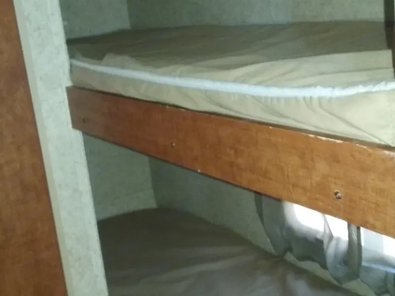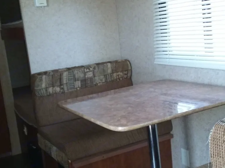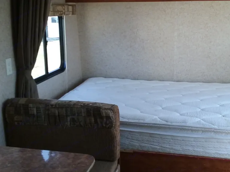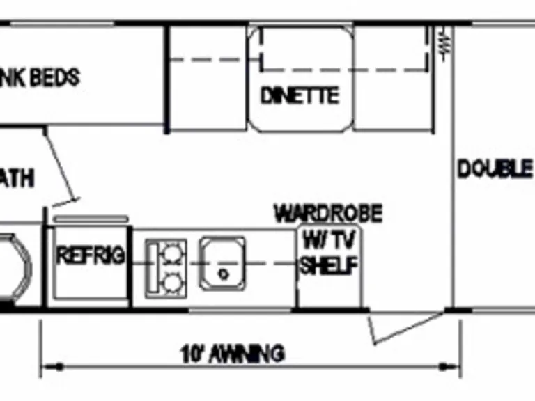 This sleeps 5. Double bed upfront, 2 single bunks and a dinette. Kitchen has 2 burner stove, microwave, and fridge. Full bath with tub and shower.