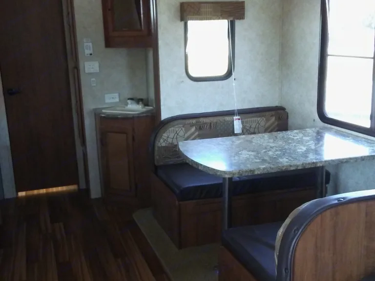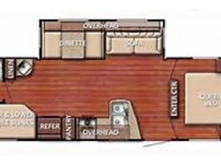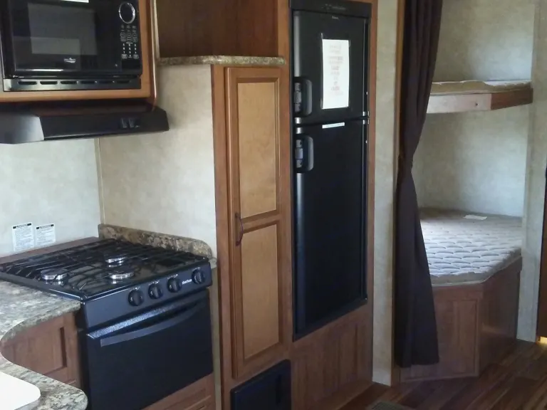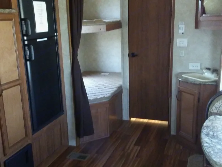 This camper sleeps 8. There is a queen bed upfront, Dinette, and two double bunks. Kitchen has 4 burner stove, and double door refrigerator. Bathroom sink and vanity.