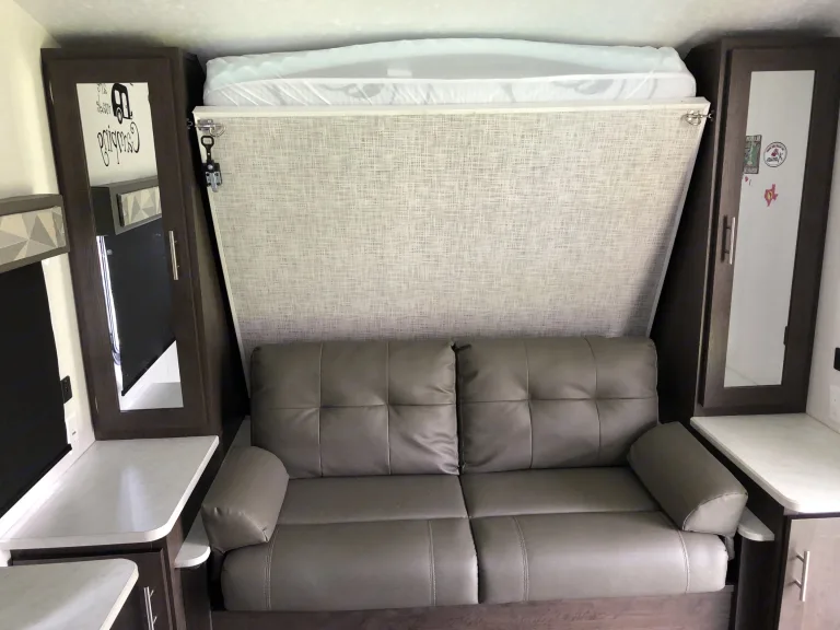 This 2019 forestriver cruise lite is 25ft hitch trailer. It sleeps 5 comfortably. The queen bed is a Murphy bed that is a bed at night and easily transforms into the couch during the day. It’s perfect for our family of 4. There are two twin bed bunks. We have made it where we can get our privacy even with kiddos. Please see pics.