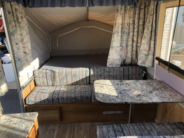Completely redone 1995 Rockwood 1901 pop up camper. This unit sleeps 6 with king size bed on one side, a queen size bed on the other and dinette collapses to a bed as well. Has a refrigerator, furnace and air conditioning. Comes with propane stove that can be used inside or outside the camper. Included with the rental is propane, a charcoal grill, pot and pans and disposable stemware and plates. I do have a generator for primitive camping at an additional charge per night. Also has an awning.