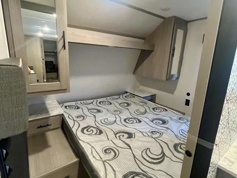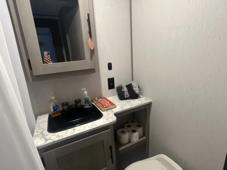 The kitchen is equipped with a seamless thermofoil countertop, undermount sink, high-rise faucet, Full size refrigerator/freezer, a glass-top three-burner cooktop, oven, and microwave. Plenty of storage above to stock your cooking needs. Don’t forget to bring your cookware (we provide 2 cooking pans, some cooking utensils and potholders) seasonings, plates, bowls, silverware and kitchen towels are your requirement. **I hope to change this soon and provide more for our customers once we have additional bookings. What's included~Sheets for Queen bed and 3 bunk beds