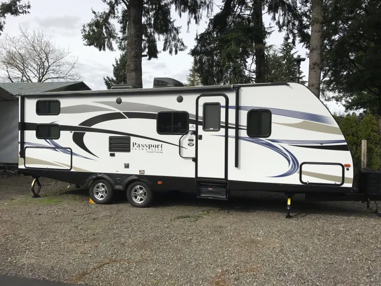 This roomy 2017 Keystone Passport has only been used a few times. It sleeps 8. There is queen-sized bed (with an upgraded mattress) in the bedroom, a hideabed folds out for 2, and bunk beds sleep 4 kids. Full bathroom with shower/bath. Kitchen equipped with pantry, microwave, refrigerator, freezer, oven, and gas-top range. Awning is large and automatic, equipped with LED lighting. Large slide out provides plenty of living space. There is a TV/DVD (although we haven't used it yet) and inside/outside stereo. Full linens, towels, washcloths, plates, cups, eating/cooking utensils, pots/pans, 3 adult camp chairs, 2 kid camp chairs, campfire roasting forks, 3 burner gas stove (gas not included). NO smoking in the unit. Campsite costs / reservations not covered.