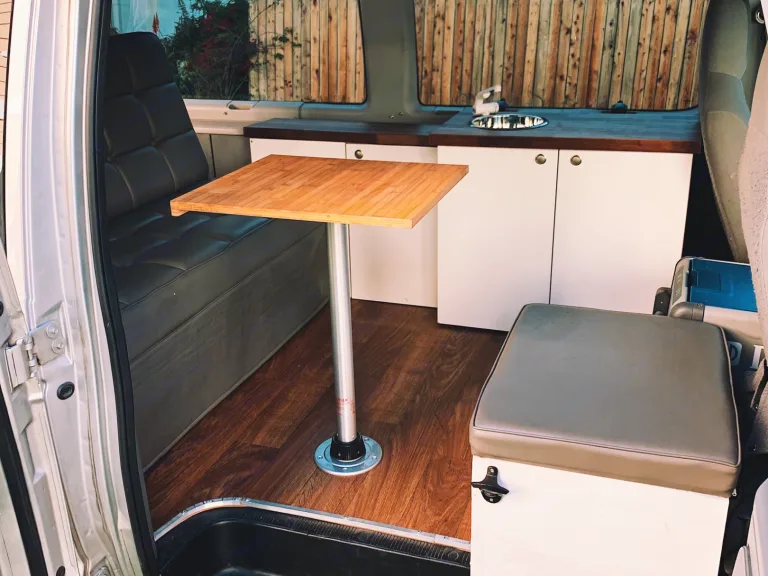 This is a great adventure van to travel in style. Van has a little pota potty, folding bed with seatbelts for 3 in the back, kitchen with water and comes with butane stove for inside and outside. The van also has a fridge and solar for charging devices, etc.
