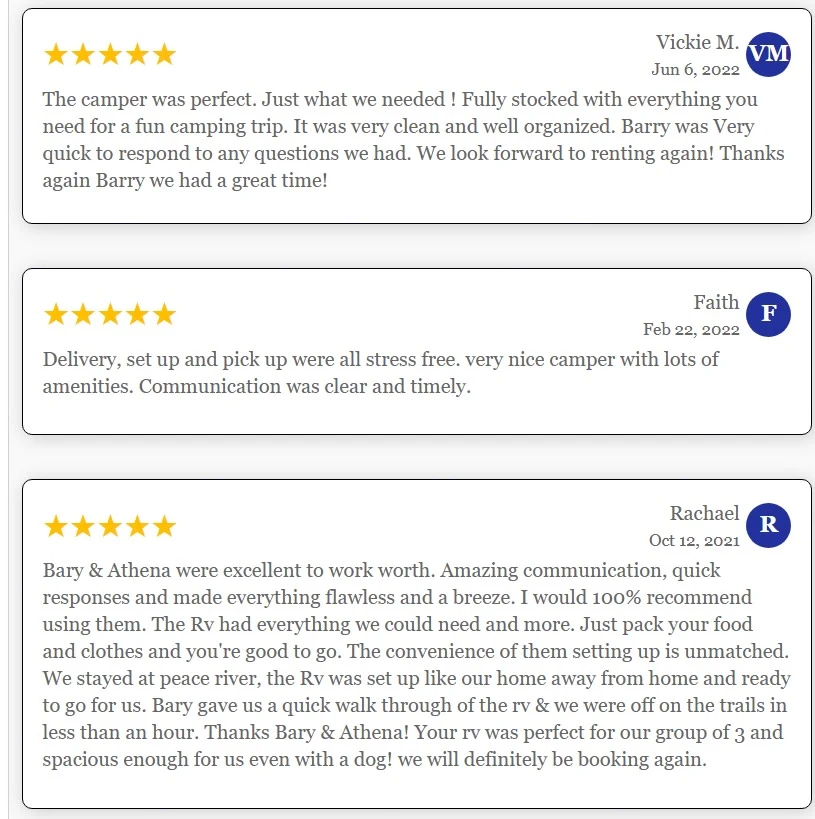 5.0RV was PERFECT for 2 people & could easily handle a small family of 3 or 4. It was very clean & well taken care of. Communication with Bary was great. Leading up to our trip, I rarely waited more than an hour or so before he answered my questions. It was delivered, setup, & ready for a quick ‘walk thru’ when we got there. Interacting with Bary & Athena, you could tell that they really cared & tried to think of everything that a renter might need. Would highly recommend this RV. WELL DONE !