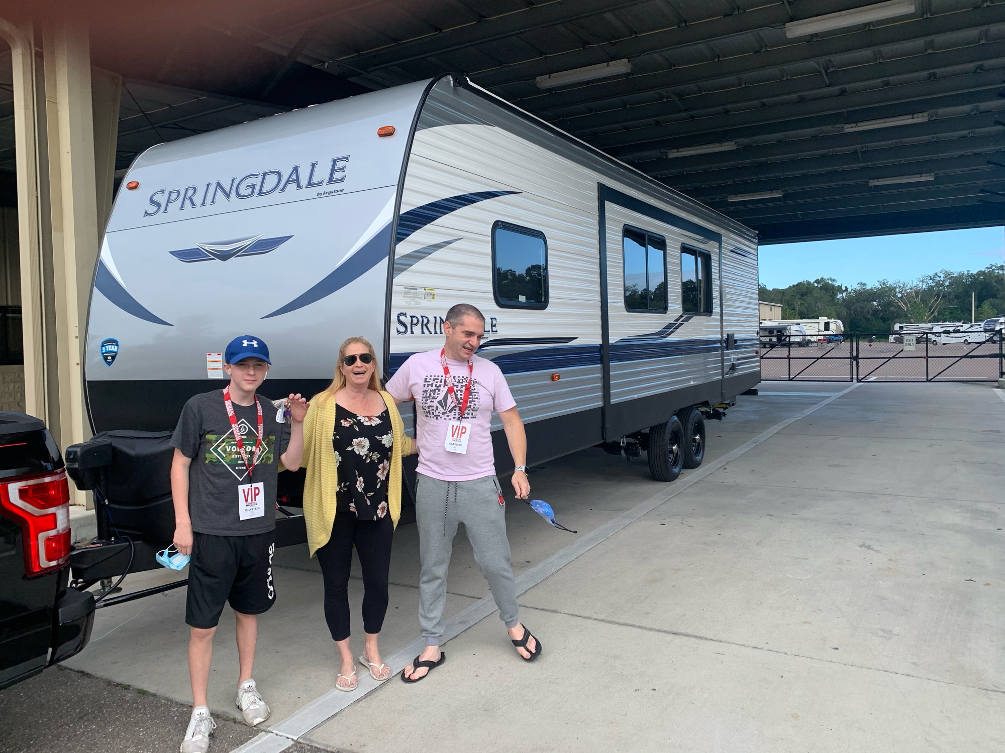 Outside, there is an awning to relax under. Outside speakers have blue LED lights for nighttime, which allows you to listen to your favorite music while sipping a cold drink. There is an outdoor kitchen fridge for your snacks and beverages and a 2- burner stove. Above the stove is storage for condiments, extra snacks, utensils, or anything else that you may want outside for easy access. There is also an outdoor station to rinse your dishes or feet or whatever else you might want to rinse off. We do have an outdoor shower that has hot and cold controls. This is great for giving any fur babies or children a quick rinse off or baths.