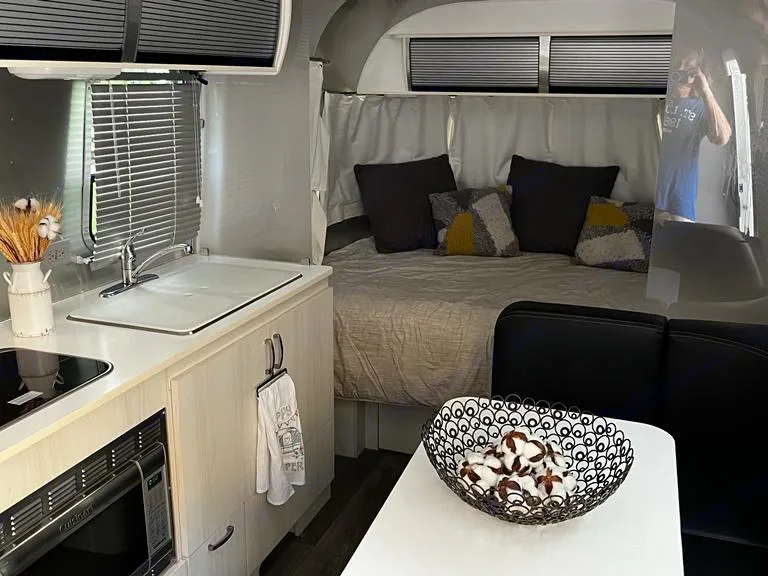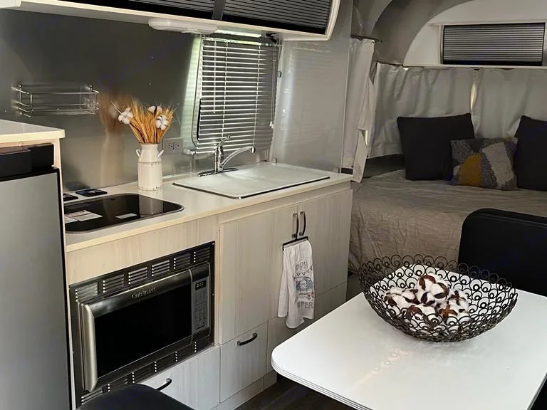 This comfy and cozy 22 foot Bambi Sport Airstream is just what a party of 4 (2 Adults and 2 kids or 3 adults) needs to have a great RV road trip. The sleek modern eye catching design makes for great aesthetics and functionality. The fabulous kitchen with gas cook top, small refrigerator, microwave and plenty of cabinet space will make meal prep a breeze. We can provide a small propane outdoor grill for added cooking options. Bathroom has spacious shower along with all the facilities of a full size bathroom. Onboard entertainment includes television and bluetooth sound system. At the end of an adventurous day you can turn in for a restful nights sleep in the queen size bedroom and the dinette quickly converts into a double bed for extra guests.