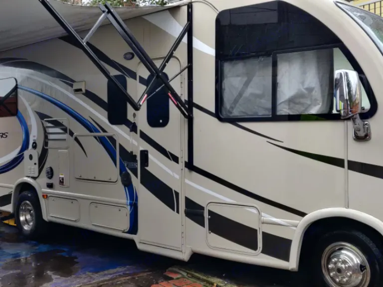 Our 2017 Thor Vegas (we call her Celeste) is a RUV style motorhome, defined as a Class A but built on a Class C Chassis (the Ford E450 chassis). This gives you the best of both worlds; an open cockpit with a huge front window like a class A, but with the convenience of driving like a Class C. If you've driven a large moving truck, you can drive Celeste!This RV comes with a master bedroom that can be setup as either a King size bed, or 2 twin beds. The drop down bunk bed over the driver's seat is perfect for a single child, and the couch converts into a queen bed that can hold 2 more (sleeps and seats a total of 5).Comes stocked with:Renters to provide: