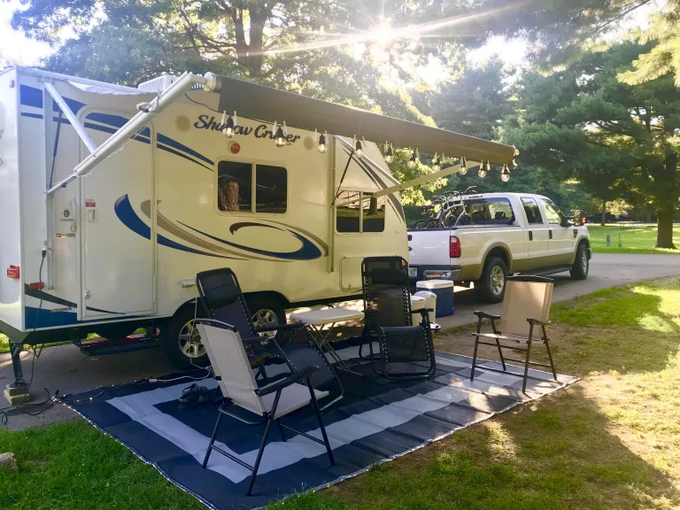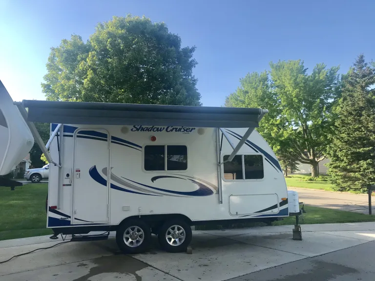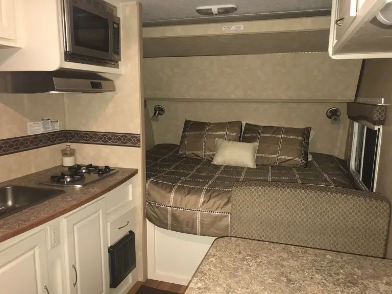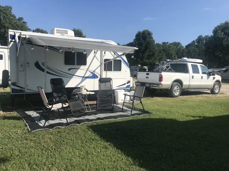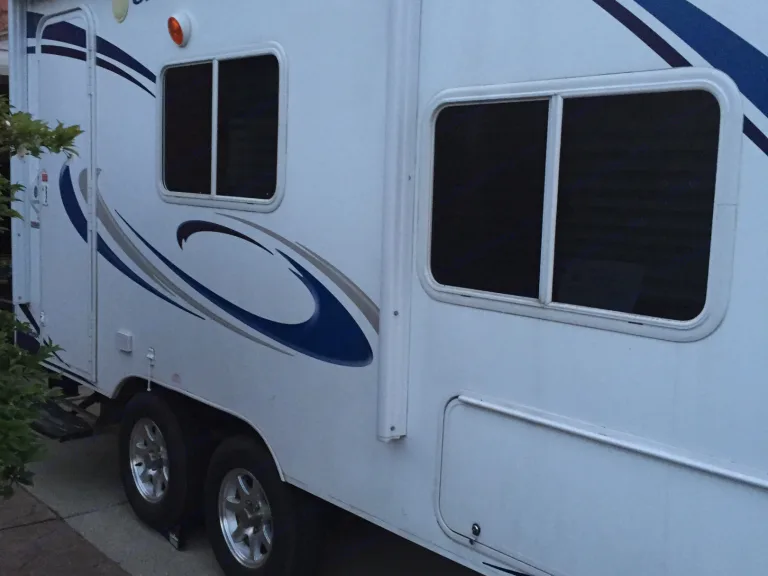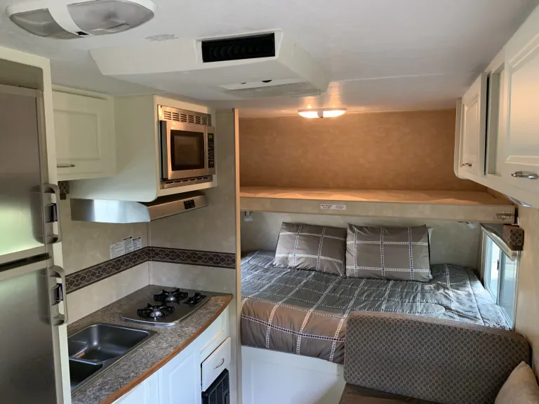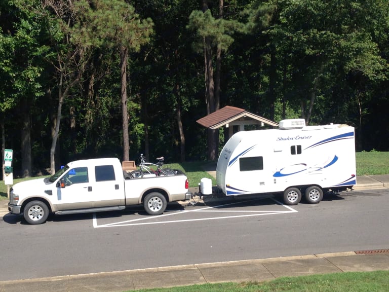 Light weight, double axle for safe towing with most vehicles. Sleeps 2 adults/2 children. Clean throughout, separate bathroom, 2 burner stove, microwave, large refrigerator, double sink,AC. AM/FM Stereo with CD player. Queen size bed and a full size bunk, bunk does have a 210 pound weight limit. Automatic awning. Kitchen has silverware dishes cups toaster and some pots and pans.. 4 cup coffee maker. Renter can pick up or delivery options are available