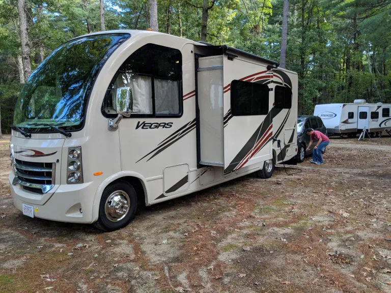 This rig is just right for two adults or a small family. It's one of the smallest in its class and has rear and side cameras so it's easy to drive. The curved glass windshield gives excellent visibility as well. A fixed king size bed, that can also convert into two twin beds, in the back gives you room to stretch, with an additional drop-down twin above the cockpit. The couch converts to a full size hide-a-bed with an air mattress. The bathroom door opens outward and locks into place to create a spacious and private changing area. An automatic and lighted awning make outdoor relaxing simple.Note: there are five seatbelts (no Latch for carseats). Two are in the cockpit and the other three are lined up on the sofa. There is a king size bed that can convert into two twins in the back, a full size air mattress bed, and a twin air mattress bed. It's suitable for five people but more comfortable for only four.We provide a hamper full of clean sheets, pillows with waterproof protectors, and comforters upon request. Mattress protectors are included and must be used with all rentals. The rig also includes all the cookware and dishes you'll need, tablecloth with clamps, outdoor rug, and folding camp chairs. There is no coffee maker in the unit.Mileage and generator fees are non-negotiable due to the impact they have on depreciation of the vehicle. Only Outdoorsy insurance is accepted- you must be fully approved for coverage in order to complete the rental.