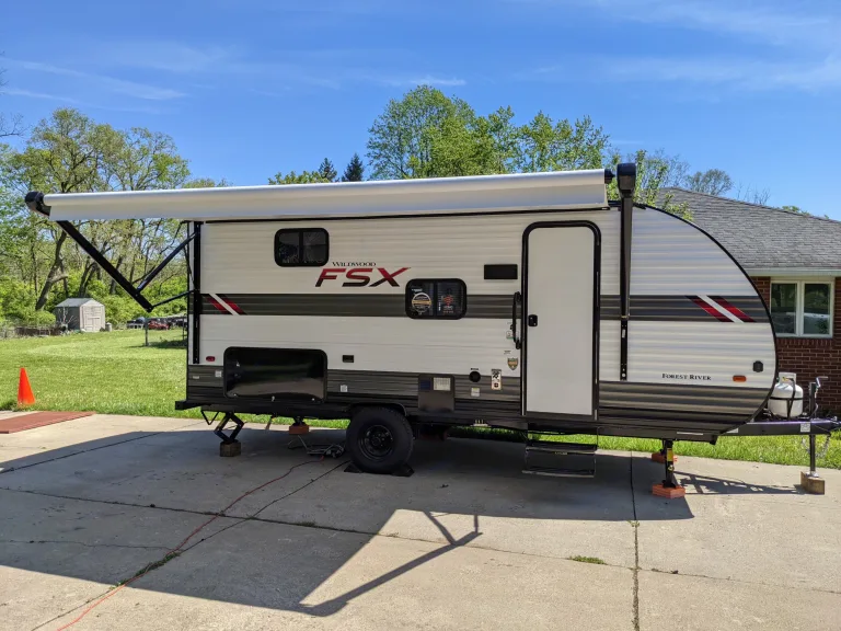 Brand new, adorable Wildwood FSX travel trailer with all the conveniences you expect, in a small, easily towable package: Fully stocked kitchen with large refrigerator, microwave, single basin sink, two burner cooktop and single-serve coffee maker, sleeping area to comfortably fit 5 adults or up to 7, with children, and full bathroom.High-end extras include heat/air conditioning, water heater, coffee maker, smart TV, hot/cold outdoor shower, 30AMP electric, fresh water hookup, sewage hookup, outdoor kitchenette with mini fridge and griddle, Bluetooth speaker, and plenty of storage.We've also installed a LevelMatePRO wireless vehicle leveling system. This allows you to quickly and easily level the camper using an app on your smartphone or tablet.What's includedWe provide clean/sanitized bedding, bath linens, pillows, a fully stocked kitchen (utensils, dishes, pots & pans, wine opener, etc.), k-cups, four outdoor camping chairs, marshmallow roasting sticks, washers game and optional generator (for additional fee).