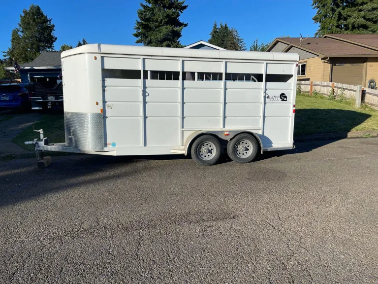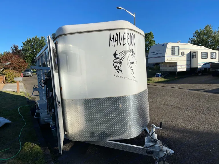 White Maverick 3 Horse slant load. Step up. Use of tack room included upon request.What's includedWe provide the tow hitch. If removal of one of the dividers is needed it can be done to make it a two horse with larger stalls.Recommendations3/4 tone or 1 ton pick up recommended for fully loaded f150 or 1500 series okay upon approval.