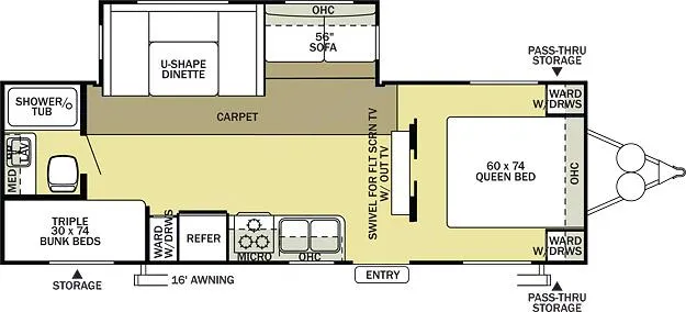 This immaculate trailer can be a great way to spend some quality time with family. The triple bunks and U-dinette leave lots of room to accommodate kids. The couch also jackknifes into a small bed, and the table folds down into another large one, and that’s all in addition to the memory foam topper queen, which the TV can be flipped to face. Full kitchen (plus propane grill) and bathroom with tub make this a home away from home, with plenty of room provided by the large power slide.